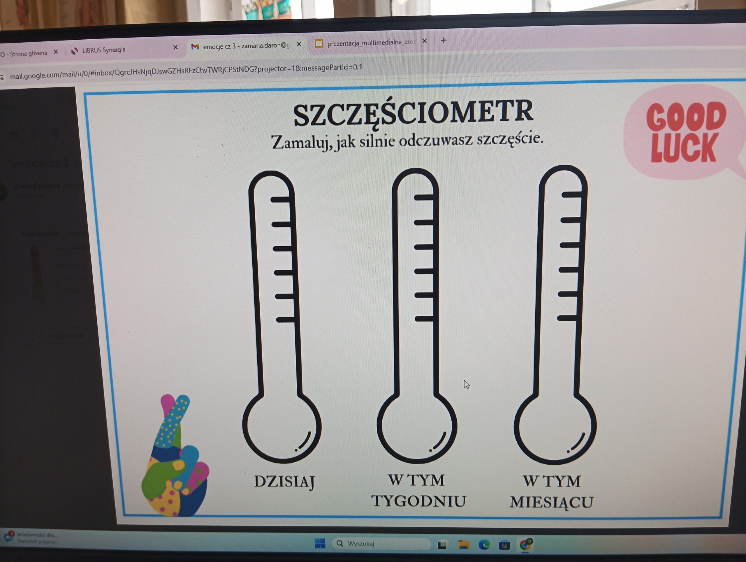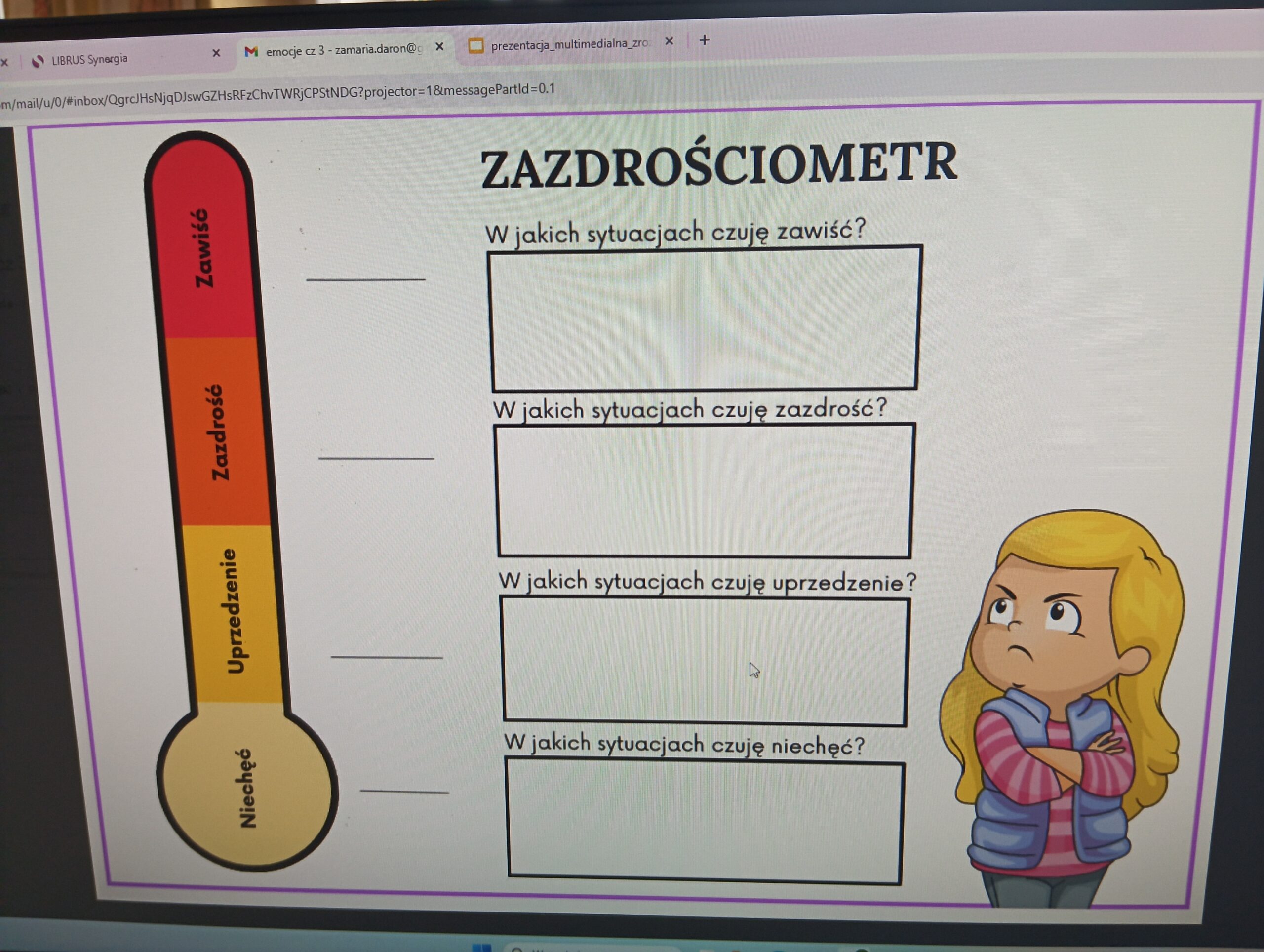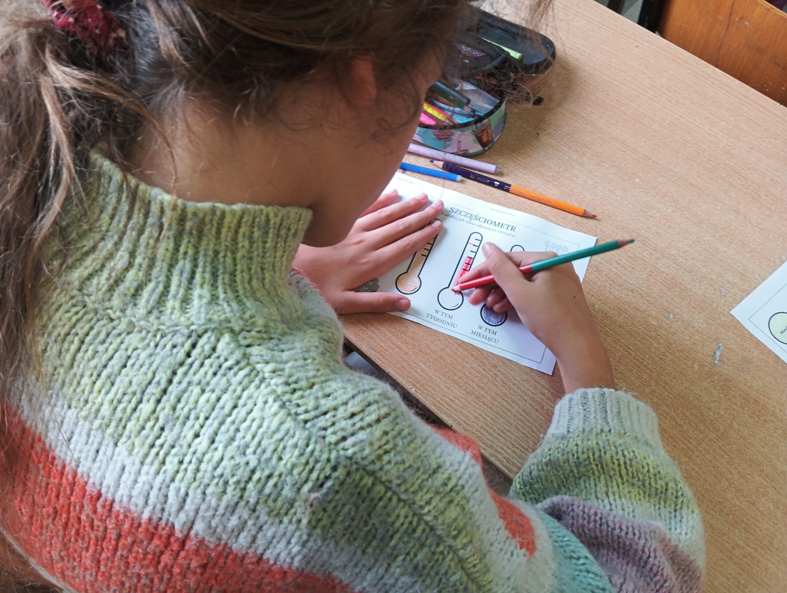 Uczniowie uczęszczający na zajęcia edukacji zdrowotnej mieli możliwość dyskusji na temat emocji i uczuć, które towarzyszą im każdego dnia. Poznawali techniki radzenia sobie z trudnymi emocjami. Przedstawiali również swoje własne metody radzenia sobie np. ze złością. Na zakończenie spotkania tworzyli własne zazdrościometry oraz szczęściometry.