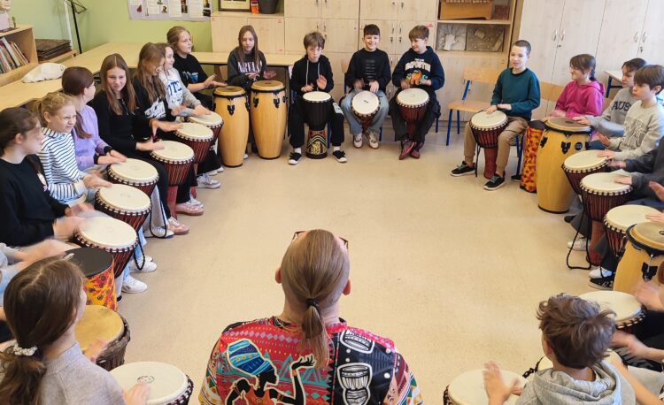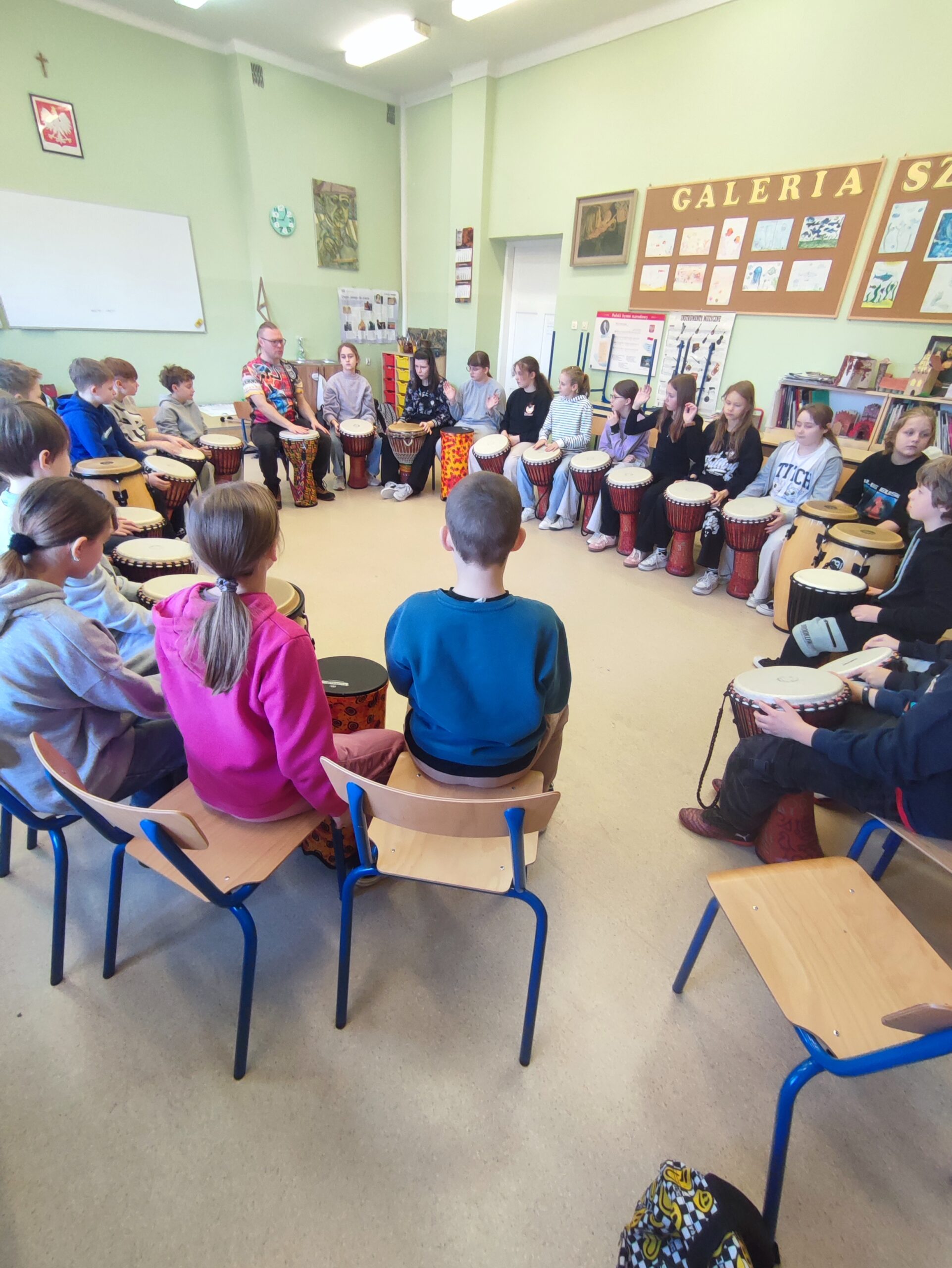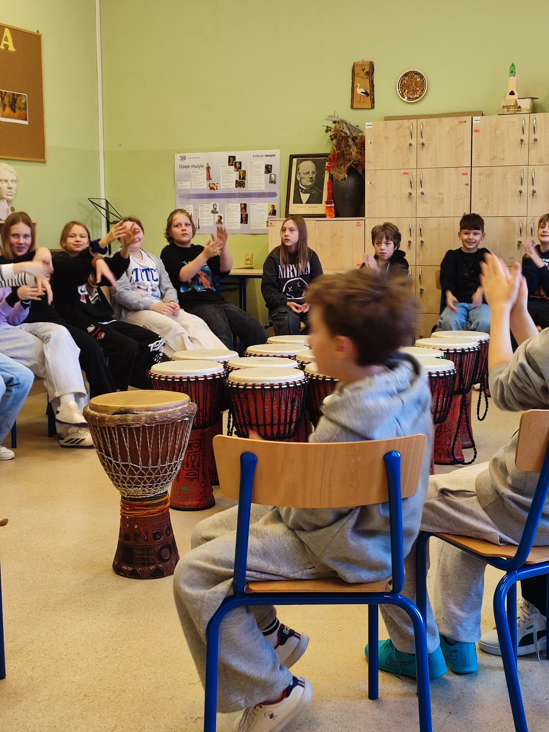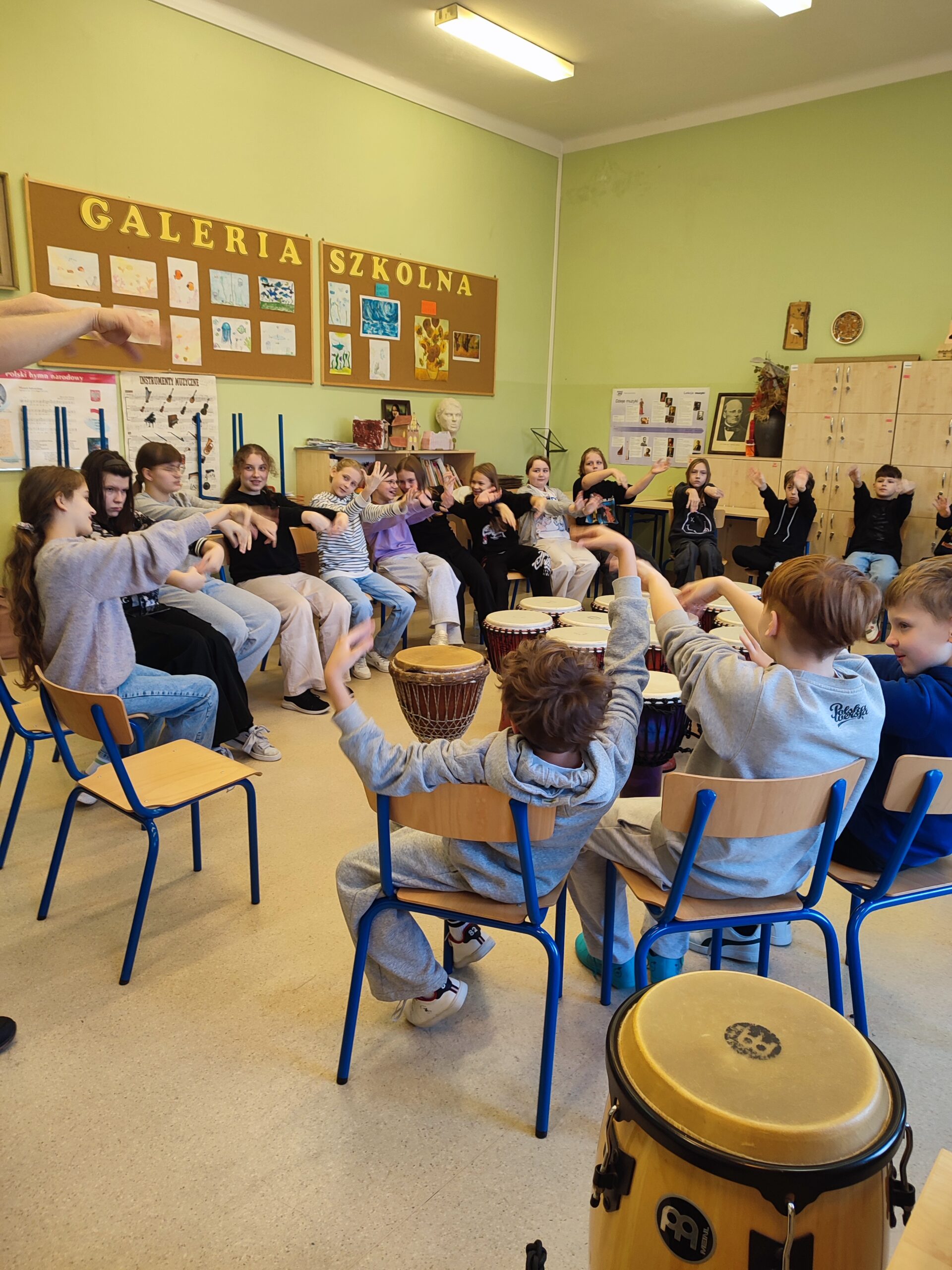 W trakcie zajęć uczniowie mieli okazję odbyć niezwykłą podróż po własnej fantazji. Prowadzący zachęcał ich do wyobrażania sobie afrykańskich krajobrazów, barwnych opowieści oraz sytuacji, które można „namalować” samym rytmem. Dzięki temu lekcja zamieniła się w pełne emocji i radości spotkanie ze światem muzyki, w którym każdy mógł poczuć się częścią większej, wspólnej opowieści.