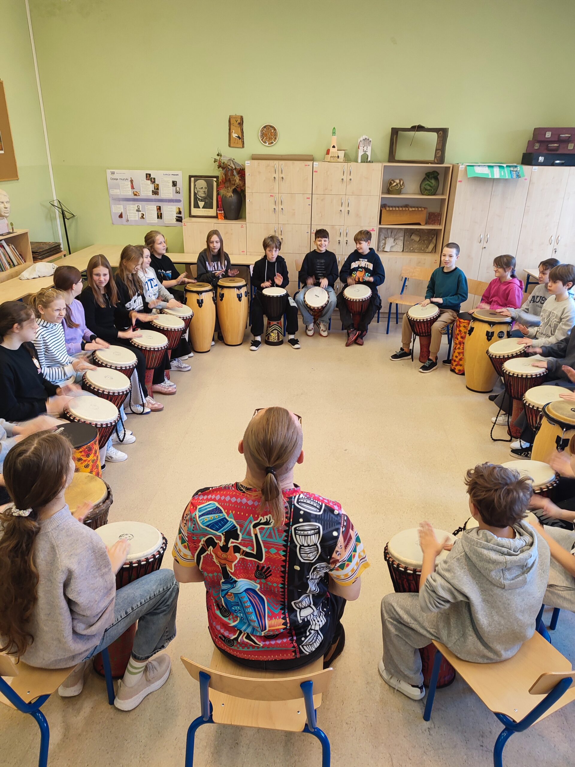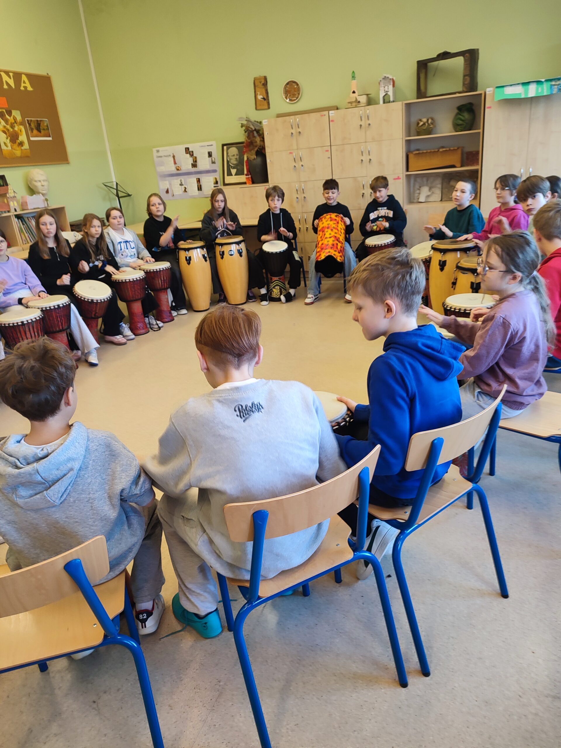 Podczas lekcji muzyki  18.11 dzieci z kl. 5a i 5b  wzięły udział w wyjątkowych warsztatach gry na bębnach afrykańskich, które poprowadził doświadczony i pełen pasji profesjonalista (Doktor King- grał na scenach w kraju i za granicą, koncertując i biorąc udział w przedsięwzięciach radiowych i telewizyjnych.; prowadzi grupę bębniarzy Djembe Kings Olsztyn).