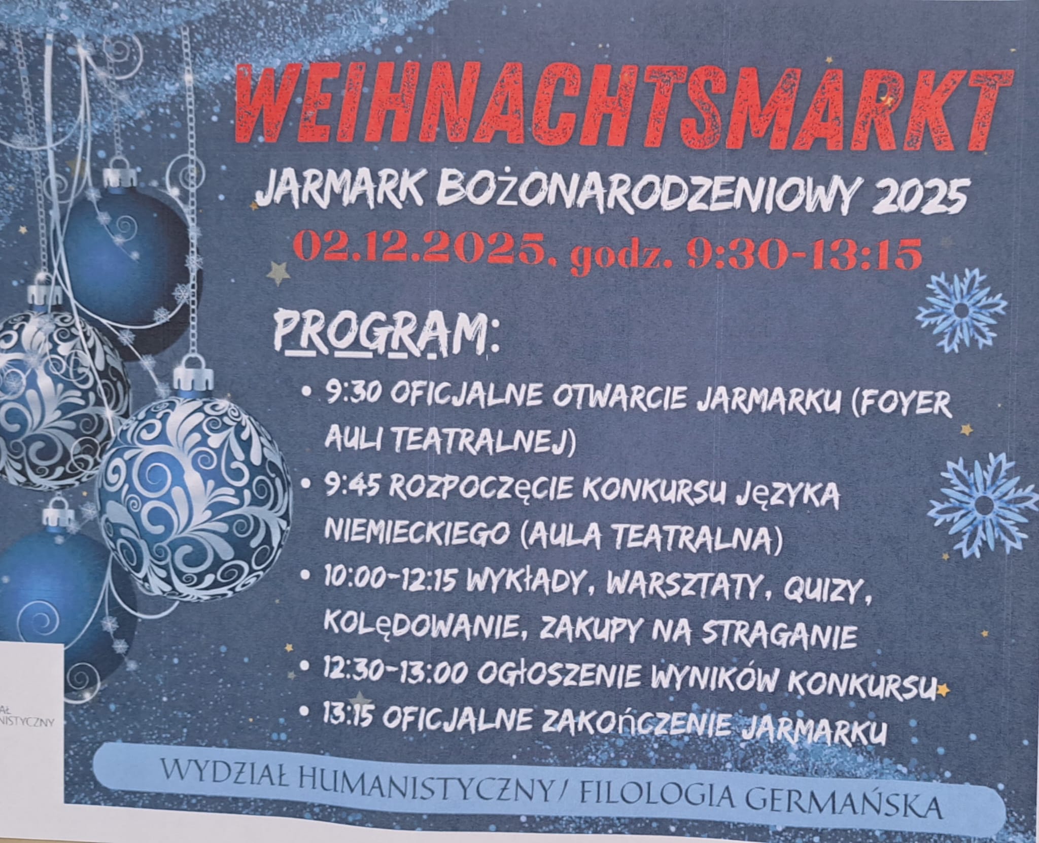 We wtorek 02 grudnia 2025 nasi ósmoklasiści brali udział w IV edycji Konkursu Języka Niemieckiego „Ðeutschfreaks”, organizowanej przez Katedrę Języka Niemieckiego oraz Katedrę Literatury i Kultury Krajów Niemieckojęzycznych UWM w Olsztynie. Konkurs odbył się na Wydziale Humanistycznym Uniwersytetu Warmińsko-Mazurskiego, na którym uczniowie mieli także przyjemność uczestniczyć w Jarmarku Bożonarodzeniowym oraz warsztatach językowych. Zwieńczeniem spotkania był koncert kolęd w wykonaniu wszystkich uczestników konkursu.