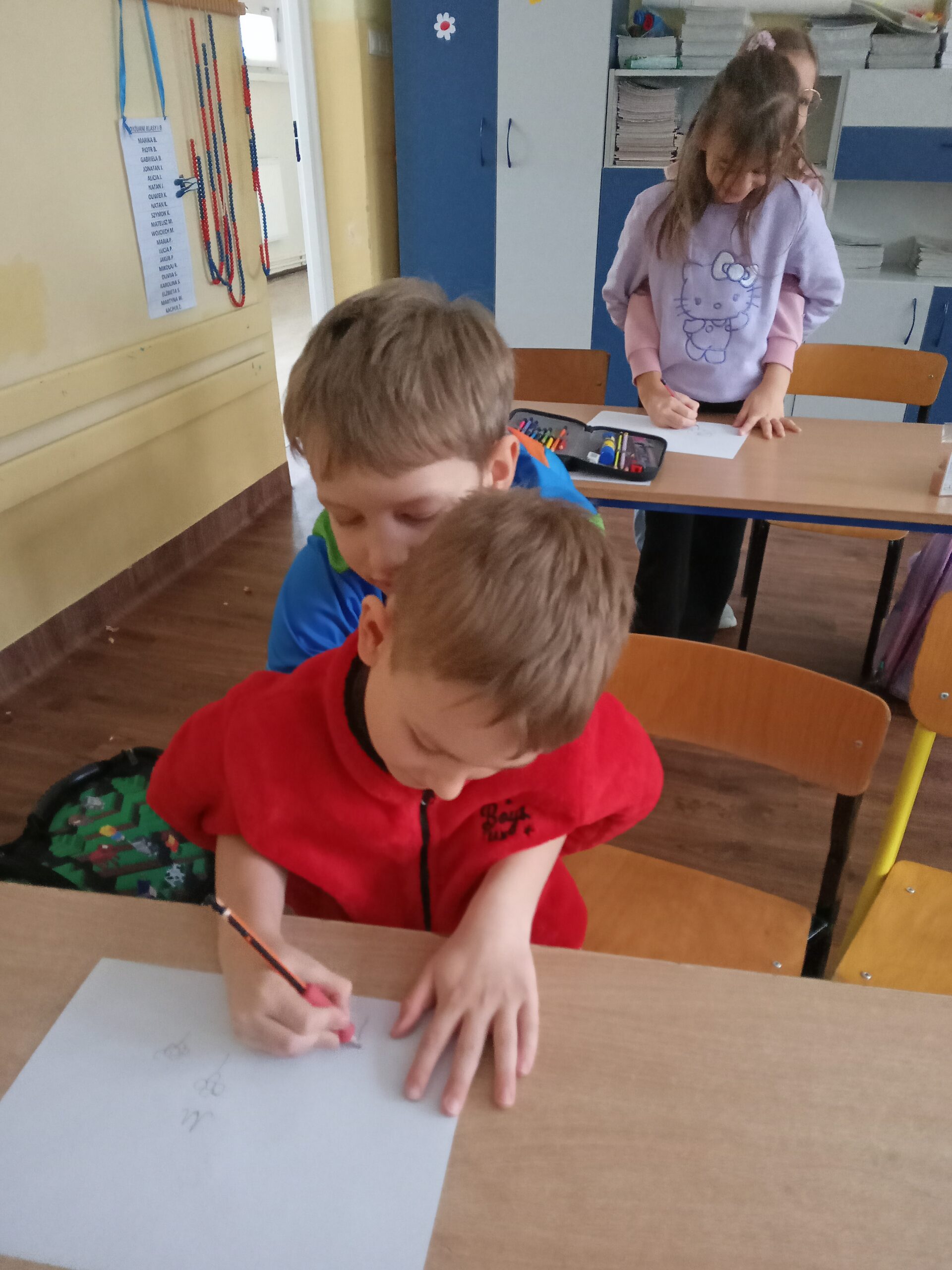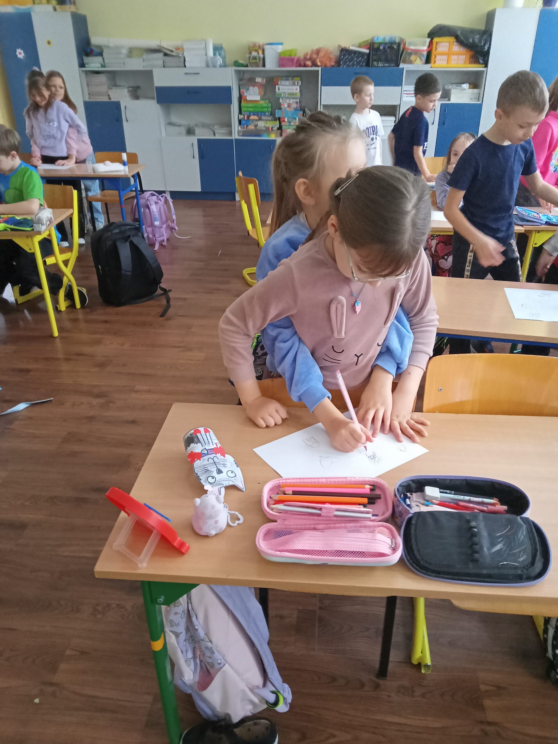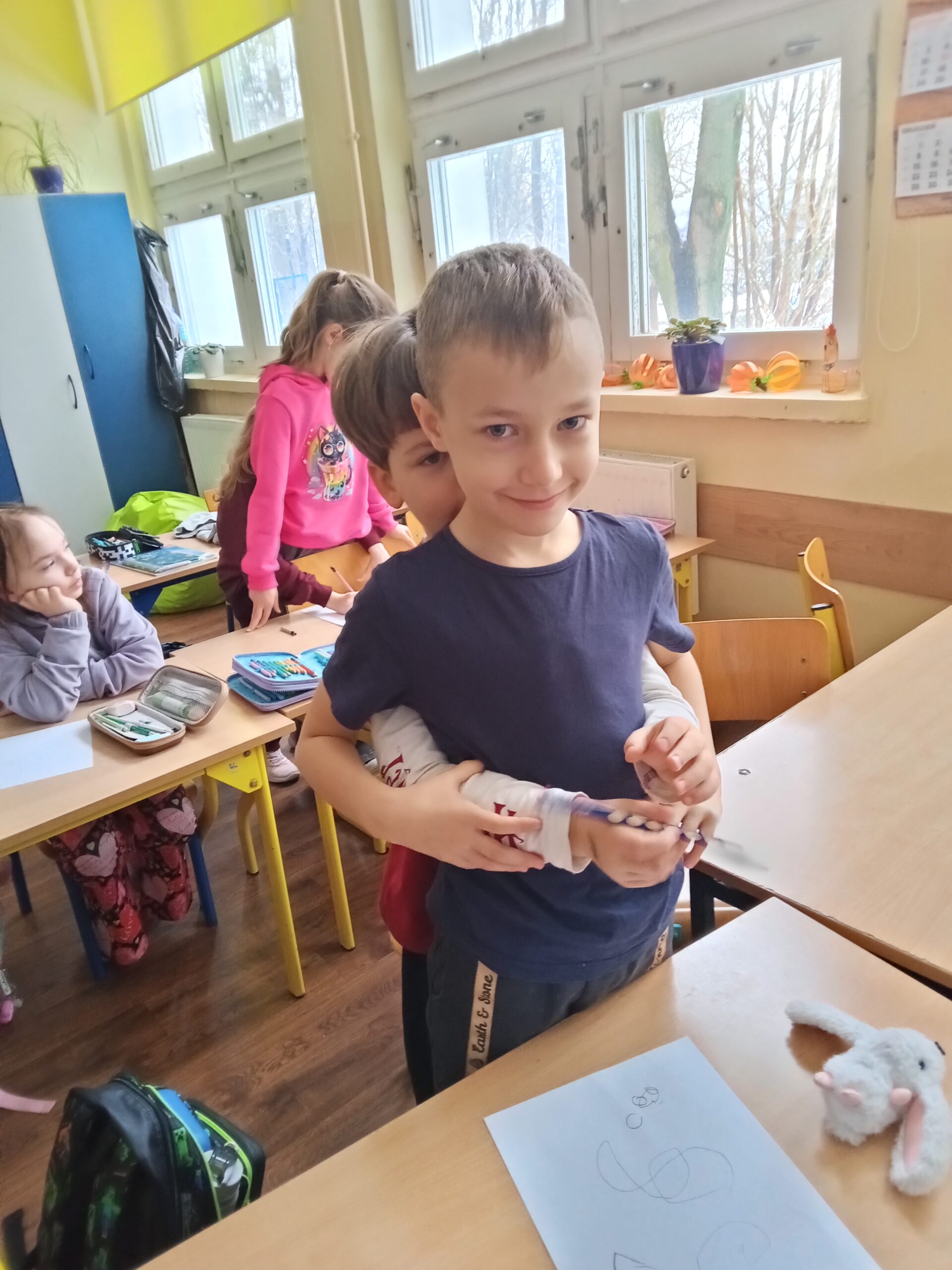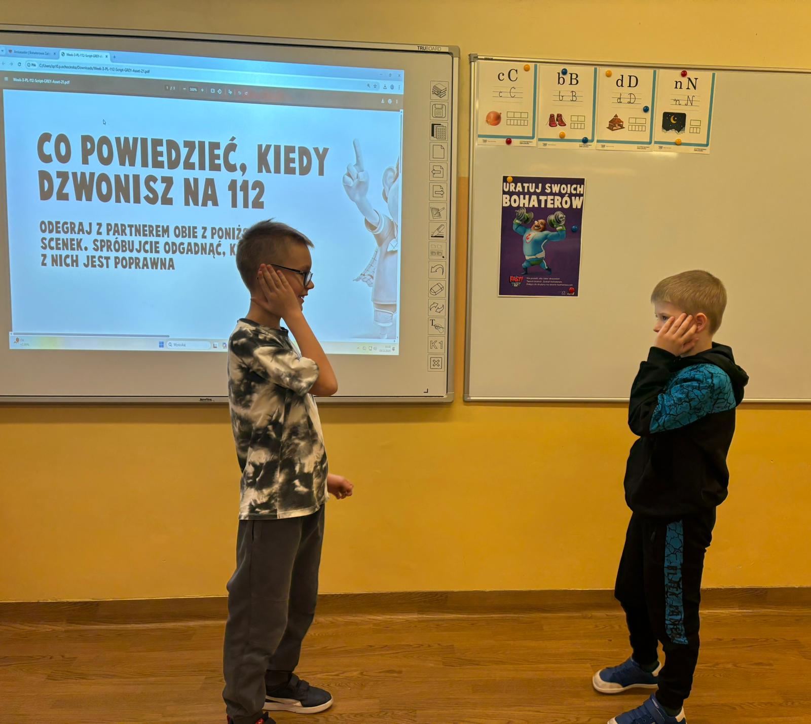 Uczniowie klas I ćwiczyli w scenkach rozmowy z dyspozytorem numeru alarmowego 112, by być gotowymi, gdy ZŁY SKRZEP zaatakuje. Dzieci wykonały także zadanie zlecone przez dziadka Arnolda – narysowanie obrazka, gdy nasze ręce są z tyłu, a osoba stojąca za naszymi plecami swoimi rękami rysuje obrazek. Okazało się, że było to bardzo trudne zadani.
