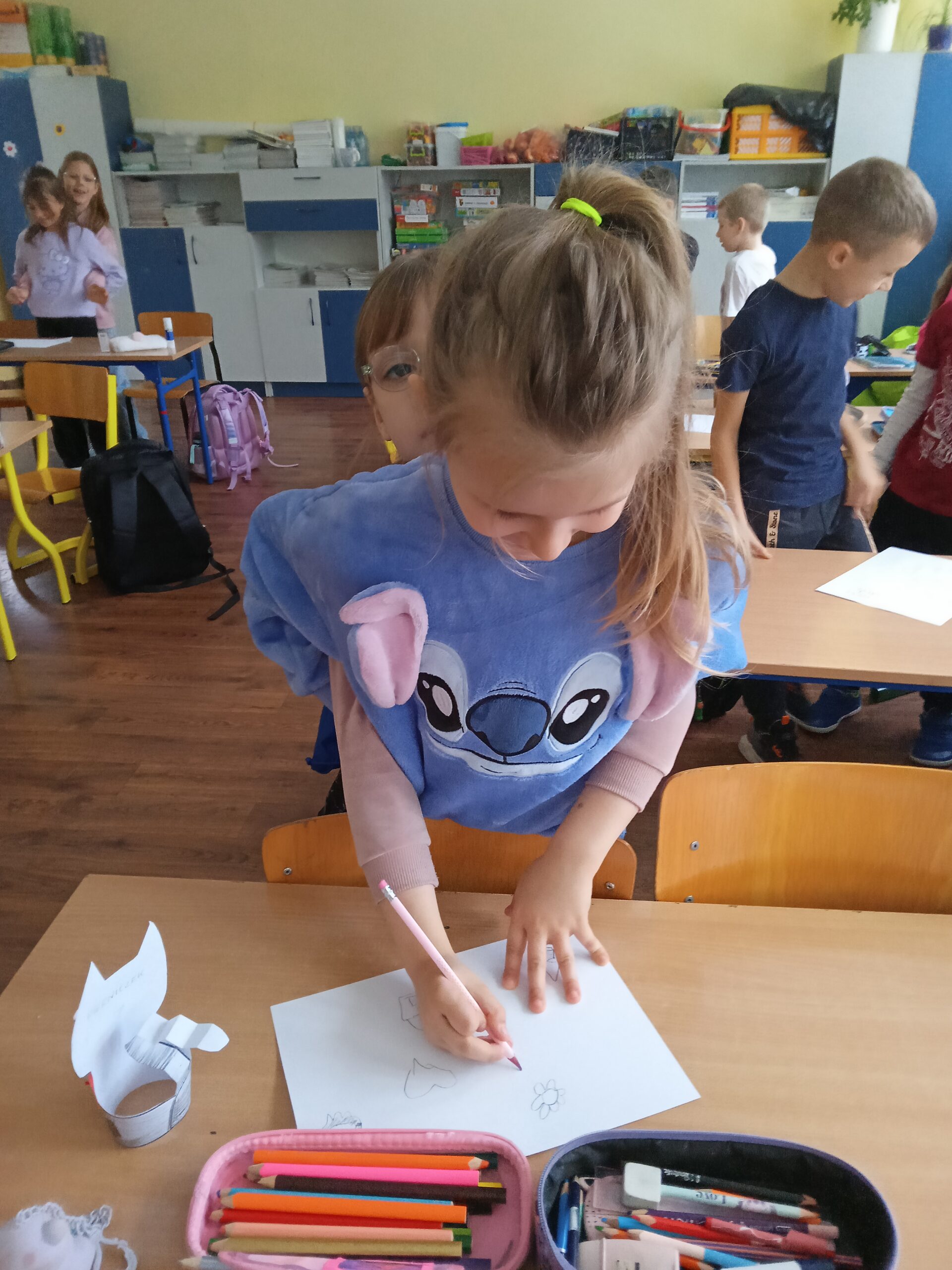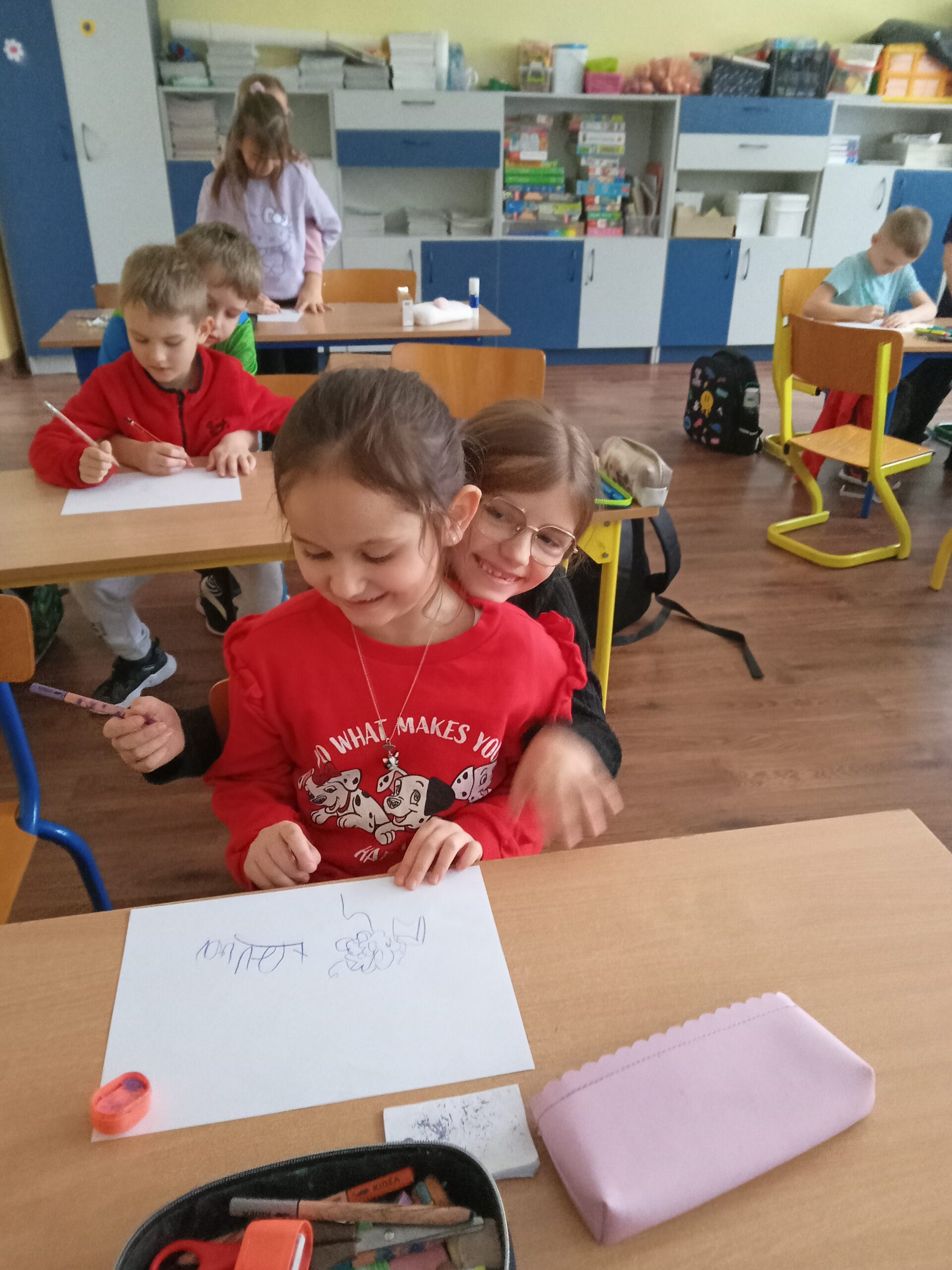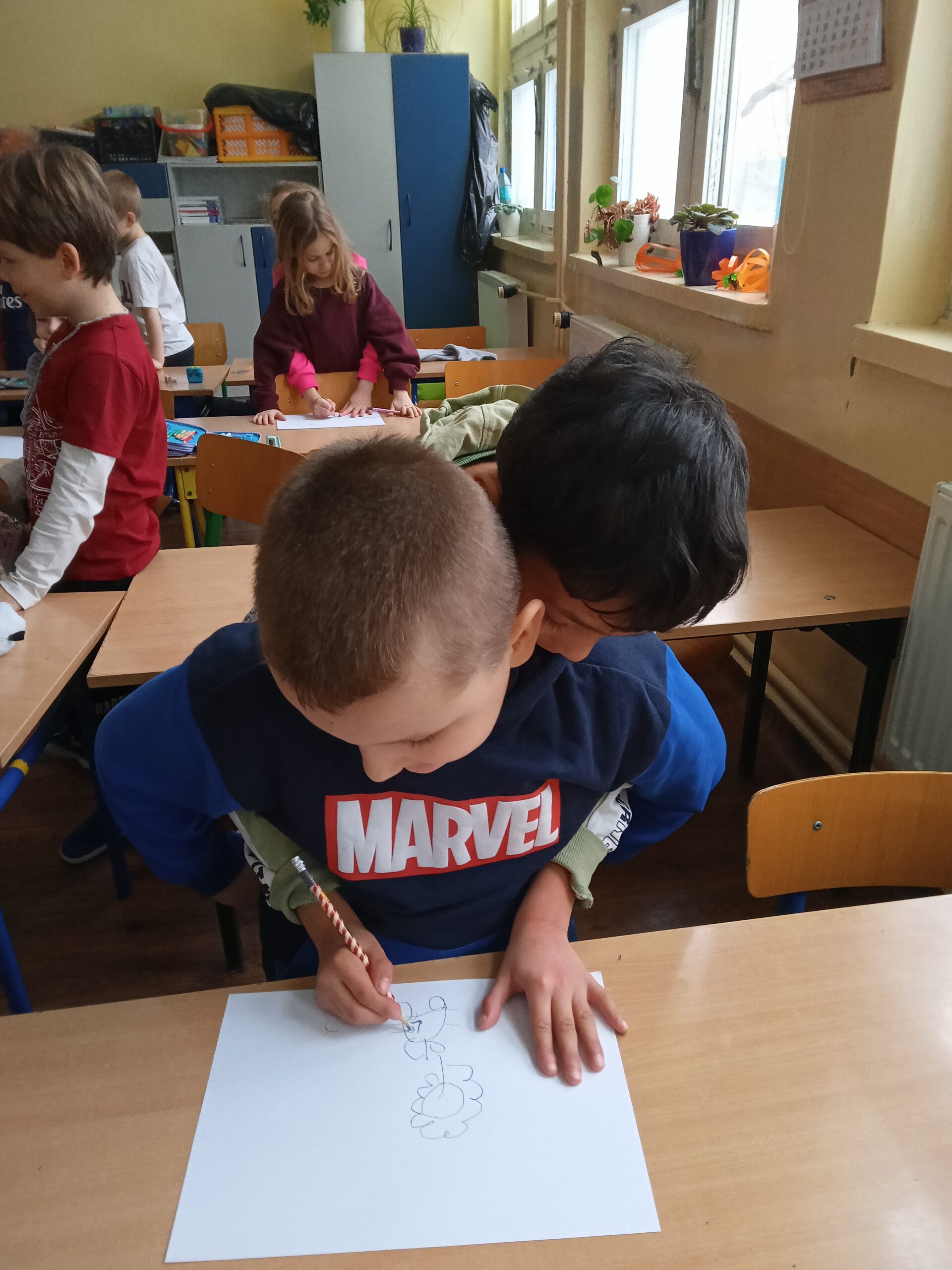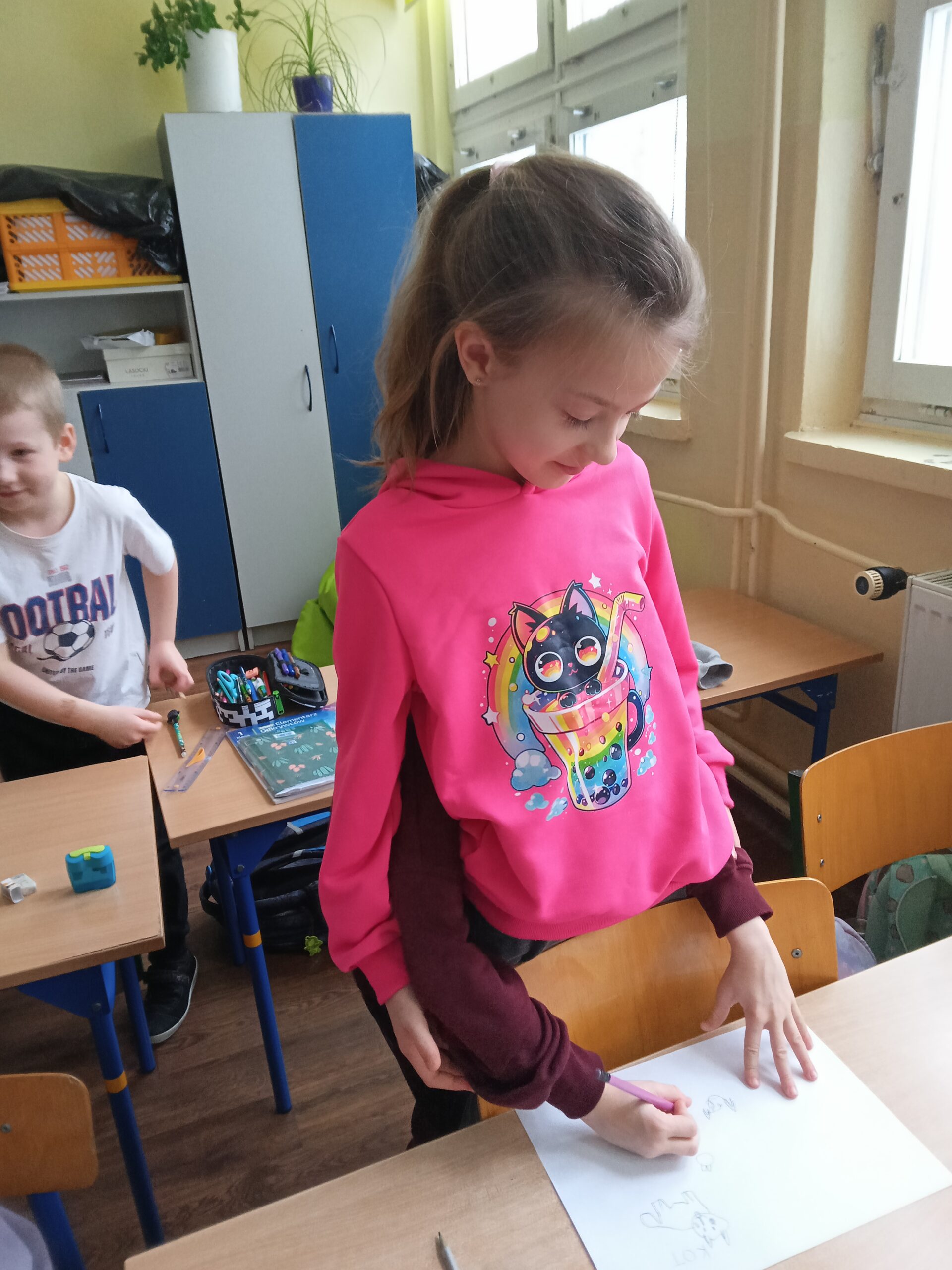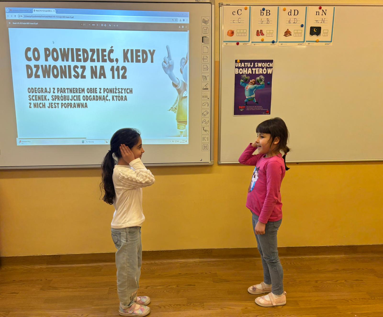 Uczniowie klas I ćwiczyli w scenkach rozmowy z dyspozytorem numeru alarmowego 112, by być gotowymi, gdy ZŁY SKRZEP zaatakuje. Dzieci wykonały także zadanie zlecone przez dziadka Arnolda – narysowanie obrazka, gdy nasze ręce są z tyłu, a osoba stojąca za naszymi plecami swoimi rękami rysuje obrazek. Okazało się, że było to bardzo trudne zadani.