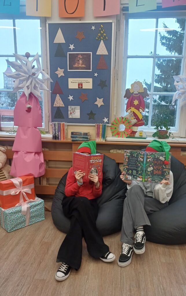 Od poniedziałku (08.12.2025r.) rozpoczynamy w bibliotece dwie akcje: “Wypożycz książkę na Święta” oraz “Przerwy przy choince w bibliotece szkolnej”.